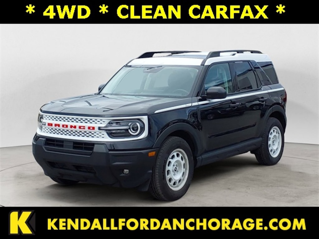 Clean CARFAX. Shadow Black 2025 Ford Bronco Sport Heritage 4WD 8-Speed Automatic 1.5L EcoBoost Convenience Package, Equipment Group 250A, Front Driver/Passenger Seat Back Map Pockets, Front reading lights, Heated 8-Way Power Driver's Seat, Illuminated entry, LED Fog Lamps, Premium Wrapped Steering Wheel, Universal Garage Door Opener (UGDO), 4-Wheel Disc Brakes, 6 Speakers, ABS brakes, Air Conditioning, Alloy wheels, AM/FM radio: SiriusXM, AM/FM Stereo, Auto High-beam Headlights, Automatic temperature control, Brake assist, Compass, Delay-off headlights, Driver door bin, Driver vanity mirror, Dual front impact airbags, Dual front side impact airbags, Electronic Stability Control, Emergency communication system: SYNC 4 911 Assist, Engine Block Heater, Four wheel independent suspension, Front anti-roll bar, Front Bucket Seats, Front Center Armrest, Fully automatic headlights, Heated door mirrors, Knee airbag, Low tire pressure warning, Occupant sensing airbag, Outside temperature display, Overhead airbag, Overhead console, Panic alarm, Passenger door bin, Passenger vanity mirror, Plaid Cloth Front Bucket Seats, Power door mirrors, Power Moonroof, Power steering, Power windows, Radio data system, Rear anti-roll bar, Rear Parking Sensors, Rear reading lights, Rear seat center armrest, Rear window defroster, Rear window wiper, Remote keyless entry, Security system, SiriusXM, Speed control, Speed-sensing steering, Speed-Sensitive Wipers, Split folding rear seat, Steering wheel mounted audio controls, SYNC 4 w/Enhanced Voice Recognition, Tachometer, Telescoping steering wheel, Tilt steering wheel, Traction control, Trip computer, Variably intermittent wipers, Wheels: 17" Oxford White-Painted Aluminum, Convenience Package, Equipment Group 250A, Front Driver/Passenger Seat Back Map Pockets, Front reading lights, Heated 8-Way Power Driver's Seat, Illuminated entry, LED Fog Lamps, Premium Wrapped Steering Wheel, Universal Garage Door Opener (UGDO). Priced below KBB Fair Purchase Price!