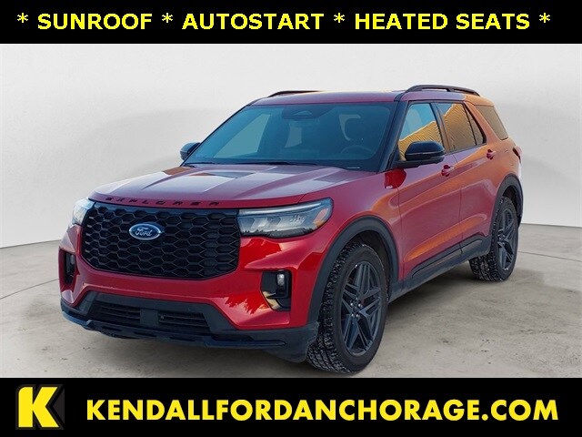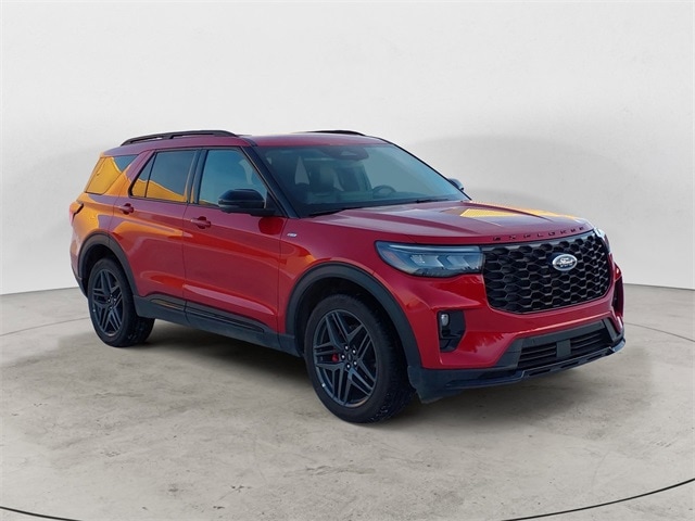 CARFAX One-Owner. Clean CARFAX. Red Metallic 2025 Ford Explorer ST-Line 4WD 10-Speed Automatic 2.3L EcoBoost I-4 4WD, Equipment Group 300A Standard Package, Performance Brakes, Red Painted Perf Front & Rear Brake Calipers, ST-Line Street Pack, Wheels: 21" Magnetite-Painted Aluminum, 10 Speakers, 110V/150W AC Power Outlet, 2nd Row Captain's Chairs w/E-Z Entry & Armrest, 2nd Row Heated Seats, 3.58 Non-Limited Slip Rear Axle, 3rd row seats: bench, 4-Wheel Disc Brakes, ABS brakes, Air Conditioning, Alloy wheels, AM/FM radio: SiriusXM with 360L, Ambient Lighting, Apple CarPlay/Android Auto, Auto High-beam Headlights, Auto-Dimming Interior Rear-View Mirror, Automatic temperature control, Brake assist, Bumpers: body-color, Compass, Delay-off headlights, Driver door bin, Driver vanity mirror, Dual front impact airbags, Dual front side impact airbags, Electronic Stability Control, Emergency communication system: 911 Assist, Engine Block Heater, Exterior Parking Camera Rear, Four wheel independent suspension, Front anti-roll bar, Front Bucket Seats, Front Center Armrest, Front dual zone A/C, Front fog lights, Front reading lights, Fully automatic headlights, Garage door transmitter, Heated door mirrors, Heated front seats, Heated steering wheel, Heated Unique Cloth Captain's Chairs, Illuminated entry, Internet access capable: FordPass Connect 5G, Knee airbag, Leather steering wheel, Low tire pressure warning, Memory Driver's Seat, Navigation System, Occupant sensing airbag, Outside temperature display, Overhead airbag, Overhead console, Panic alarm, Panoramic Vista Roof w/Power Shade, Passenger door bin, Passenger vanity mirror, Power door mirrors, Power driver seat, Power Liftgate, Power passenger seat, Power steering, Power windows, Power-Folding Sideview Mirrors w/Autofold, Premium Package, Radio: B&O Sound System by Bang & Olufsen, Rain-Sensing Wipers (Front Only), Rear air conditioning, Rear anti-roll bar, Rear reading lights, Rear window defroster, Rear window wiper, Remote keyless entry, SecuriCode Keyless Entry Keypad, Security system, Speed control, Speed-sensing steering, Speed-Sensitive Wipers, Split folding rear seat, Spoiler, Steering wheel mounted audio controls, Tachometer, Telescoping steering wheel, Tilt steering wheel, Traction control, Trip computer, Variably intermittent wipers, Wheels: 20" Ebony-Painted Machined Aluminum, Wireless Charging Pad, 4WD, Equipment Group 300A Standard Package, Performance Brakes, Red Painted Perf Front & Rear Brake Calipers, ST-Line Street Pack, Wheels: 21" Magnetite-Painted Aluminum.
