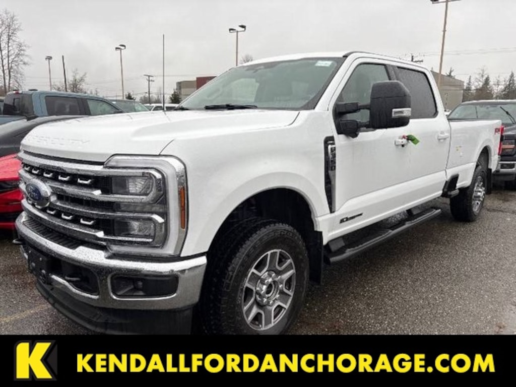 CARFAX One-Owner. Clean CARFAX. White 2025 Ford F-350SD Lariat 4WD 10-Speed Automatic Power Stroke 6.7L V8 DI 32V OHV Turbodiesel 4WD, 190 Amp Alternator, 3.73 Axle Ratio, 4-Wheel Disc Brakes, 8 Speakers, ABS brakes, Adjustable pedals, Air Conditioning, Alloy wheels, AM/FM radio: SiriusXM with 360L, Auto High-beam Headlights, Auto-dimming Rear-View mirror, Automatic temperature control, BLIS with Cross-Traffic Alert, Brake assist, Bumpers: chrome, Compass, Delay-off headlights, Driver door bin, Driver vanity mirror, Dual front impact airbags, Dual front side impact airbags, Electronic Stability Control, Emergency communication system: SYNC 4 911 Assist, Flow-Through Console, Front ActiveX Trimmed 40/Console/40 Seats, Front anti-roll bar, Front Bucket Seats, Front Center Armrest, Front dual zone A/C, Front fog lights, Front reading lights, Fully automatic headlights, Garage door transmitter, Heated door mirrors, Heated front seats, Heated rear seats, Heated steering wheel, Illuminated entry, Internet access capable: FordPass Connect 5G, Low tire pressure warning, Memory seat, Navigation System, Order Code 618A, Outside temperature display, Overhead airbag, Overhead console, Panic alarm, Passenger door bin, Passenger vanity mirror, Pedal memory, Power door mirrors, Power driver seat, Power passenger seat, Power steering, Power windows, Privacy Glass, Radio: B&O Sound System by Bang and Olufsen, Rain sensing wipers, Rear Parking Sensors, Rear reading lights, Rear seat center armrest, Rear step bumper, Rear window defroster, Remote keyless entry, Security system, SiriusXM Radio with 360L, Speed control, Split folding rear seat, Steering wheel mounted audio controls, SYNC 4 with Enhanced Voice Recognition, Tachometer, Telescoping steering wheel, Tilt steering wheel, Traction control, Trip computer, Turn signal indicator mirrors, Variably intermittent wipers, Ventilated front seats, Wheels: 18" Bright Machined and Carbonized Gray Aluminum, 4WD.