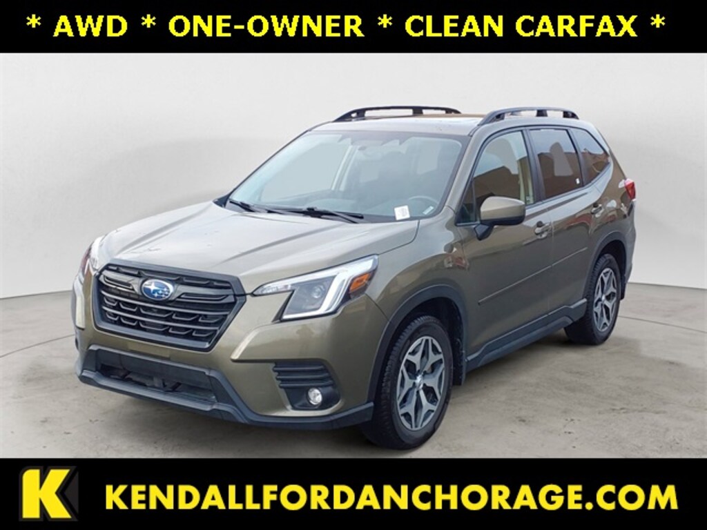 CARFAX One-Owner. Clean CARFAX. Green Metallic 2024 Subaru Forester Premium AWD Lineartronic CVT 2.5L 4-Cylinder DOHC 16V 6 Speakers, AM/FM radio: SiriusXM, Anti-whiplash front head restraints, Dual front impact airbags, Knee airbag, Radio data system, Radio: Subaru STARLINK 6.5" Multimedia Plus System, Speed-sensing steering, Traction control, 3.70 Axle Ratio, 4-Wheel Disc Brakes, ABS brakes, Air Conditioning, Alloy wheels, Auto High-beam Headlights, Automatic temperature control, Blind Spot Detection w/RCTA & Power Rear Gate, Blind-Spot Detection (BSD), Body Side Molding - Autumn Green Metallic, Brake assist, Bumpers: body-color, Door Projector Lights, Driver door bin, Driver vanity mirror, Driver's Seatback Divided Pocket, Dual front side impact airbags, Dual USB Charge Ports, Electronic Stability Control, Emergency communication system: STARLINK Safety and Security (Subscription Required), Exterior Parking Camera Rear, EyeSight System, Four wheel independent suspension, Front anti-roll bar, Front Bucket Seats, Front Center Armrest, Front fog lights, Front reading lights, Fully automatic headlights, Heated door mirrors, Heated Front Bucket Seats, Heated front seats, Illuminated entry, Leather steering wheel, LED Upgrade, Low tire pressure warning, Multi-Function High Grade Display, Occupant sensing airbag, Outside temperature display, Overhead airbag, Overhead console, Panic alarm, Passenger door bin, Passenger vanity mirror, Power door mirrors, Power driver seat, Power moonroof: Panoramic, Power Rear Gate, Power steering, Power windows, Premium Cloth Upholstery, Rear anti-roll bar, Rear seat center armrest, Rear window defroster, Rear window wiper, Remote keyless entry, Roof rack: rails only, Security system, Speed control, Splash Guards, Split folding rear seat, Spoiler, STARLINK/Apple CarPlay/Android Auto, Steering wheel mounted audio controls, Tachometer, Telescoping steering wheel, Tilt steering wheel, Trip computer, Variably intermittent wipers, Wheels: 17" x 7.0 J Black Machine Finish Alloy, 6 Speakers, AM/FM radio: SiriusXM, Anti-whiplash front head restraints, Dual front impact airbags, Knee airbag, Radio data system, Radio: Subaru STARLINK 6.5" Multimedia Plus System, Speed-sensing steering, Traction control.